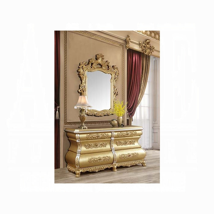 There is nothing more sophisticated and luxurious than the Seville Dining Room Collection that makes anyone catch their breath at first glance. Luxuriously carved ornaments and lustrous gold finishes on wooden frame set the room's opulent tone. The double pedestal base bestows a classic silhouette on the rectangular dining table, while the dining chairs are beautifully designed with gentle curves and padded seats. Matching curio and server help you create a practical, stylish, and organized space. Indulge in lavish comfort with the Seville Dining Room Collection.