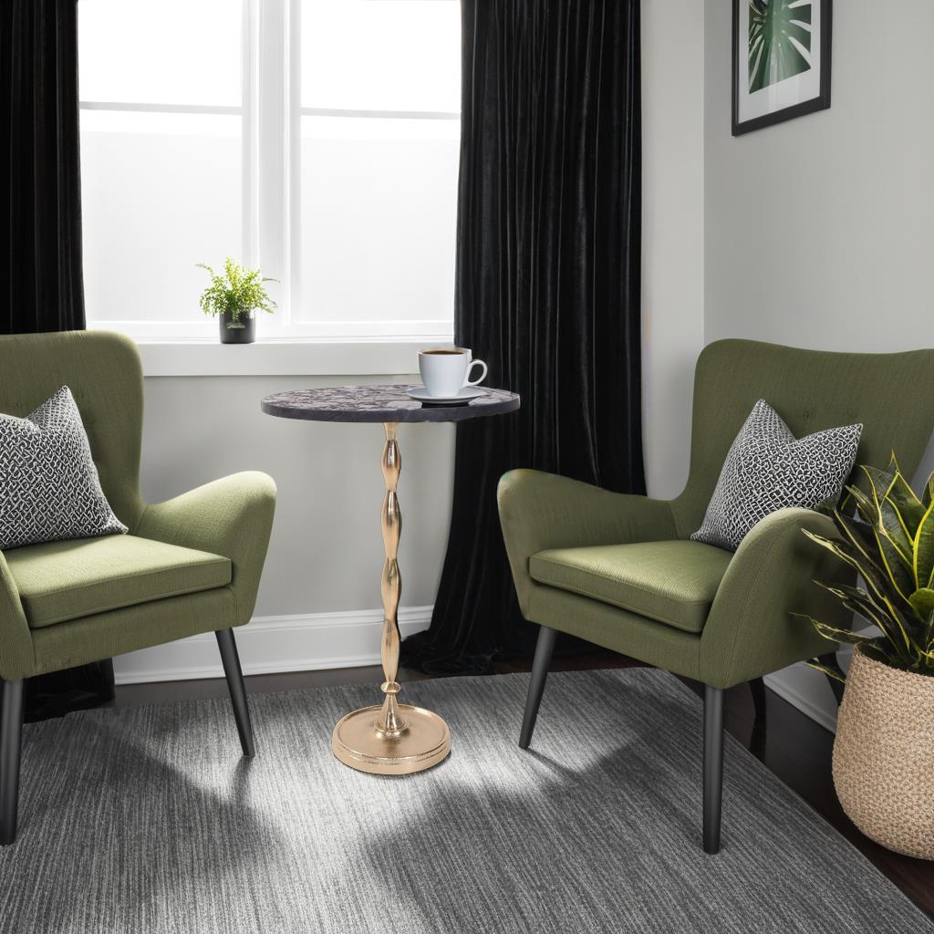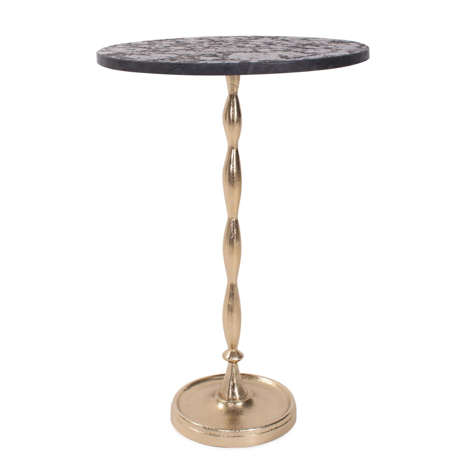 Featuring a sleek, black marble top paired with a beautifully sculpted gold base, this table strikes the perfect balance between sophistication and functionality. Its twisted, slender stand adds an artistic element, making it an ideal accent piece.