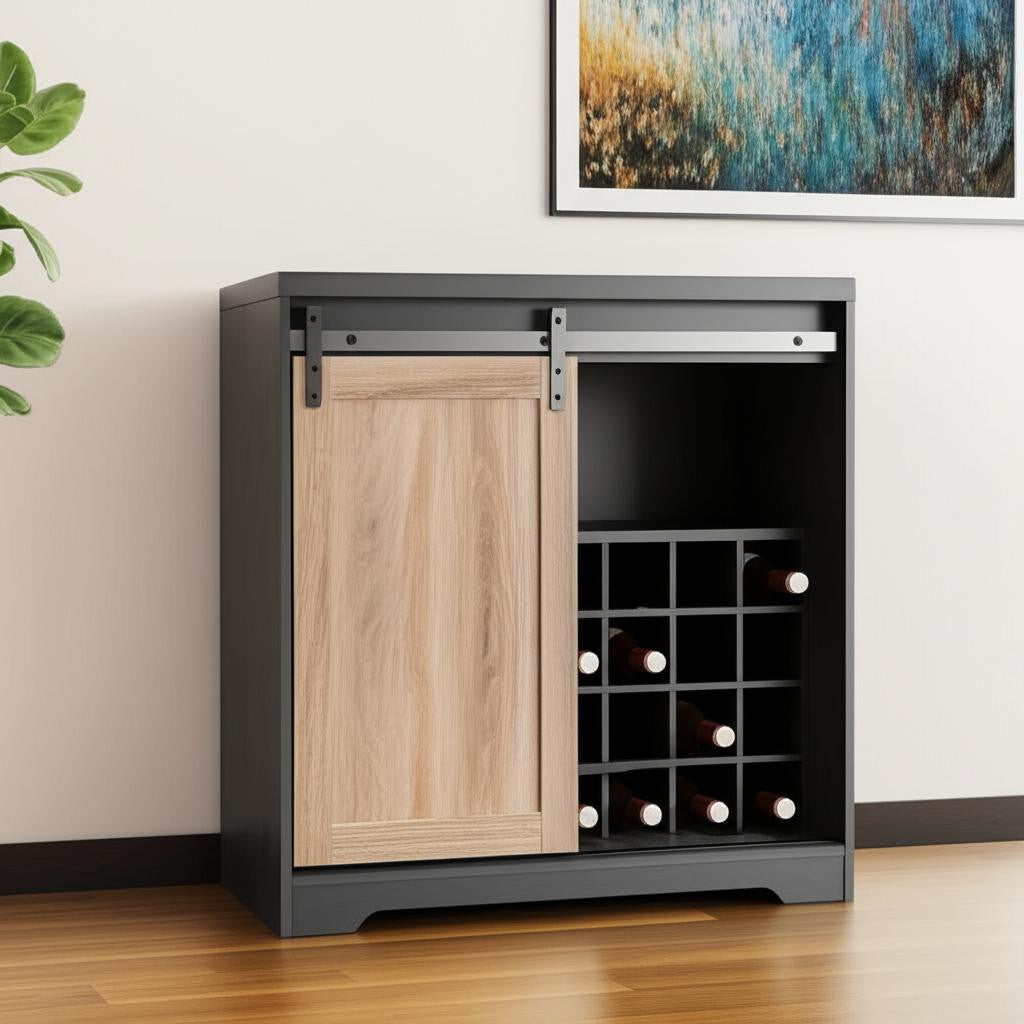 32" Charcoal And Natural Wood Barn Door Bar Cabinet