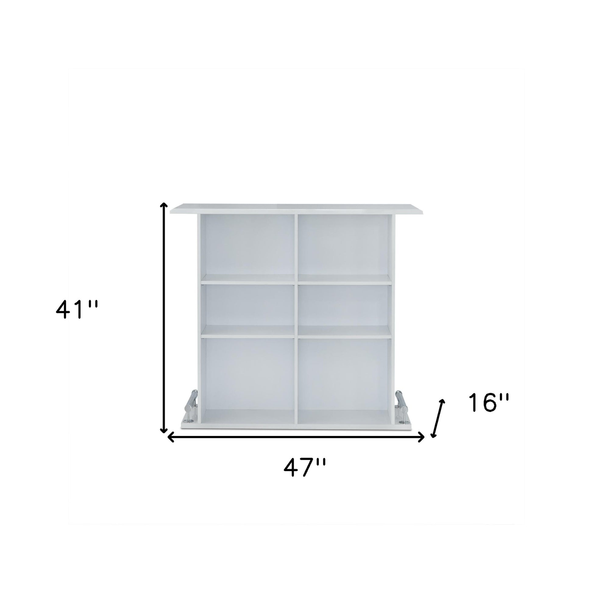 The 47-inch white wood rectangular bar table is a perfect addition for elevating your dining experience. Its contemporary style blends seamlessly with modern décor, making it a versatile choice for various settings. Crafted from durable manufactured wood, both the top and base exude elegance in a pristine white finish. The fixed table mechanism ensures stability, while the pedestal base design offers ample legroom for comfortable seating. Handcrafted construction highlights the attention to detail and quality, making each piece unique. Additionally, storage included within the table enhances functionality, providing a convenient space for utensils or décor. This table is ideal for intimate gatherings or lively celebrations, combining aesthetics and practicality effortlessly. 41.00-inch h x 47.00-inch w x 16.00-inch d .