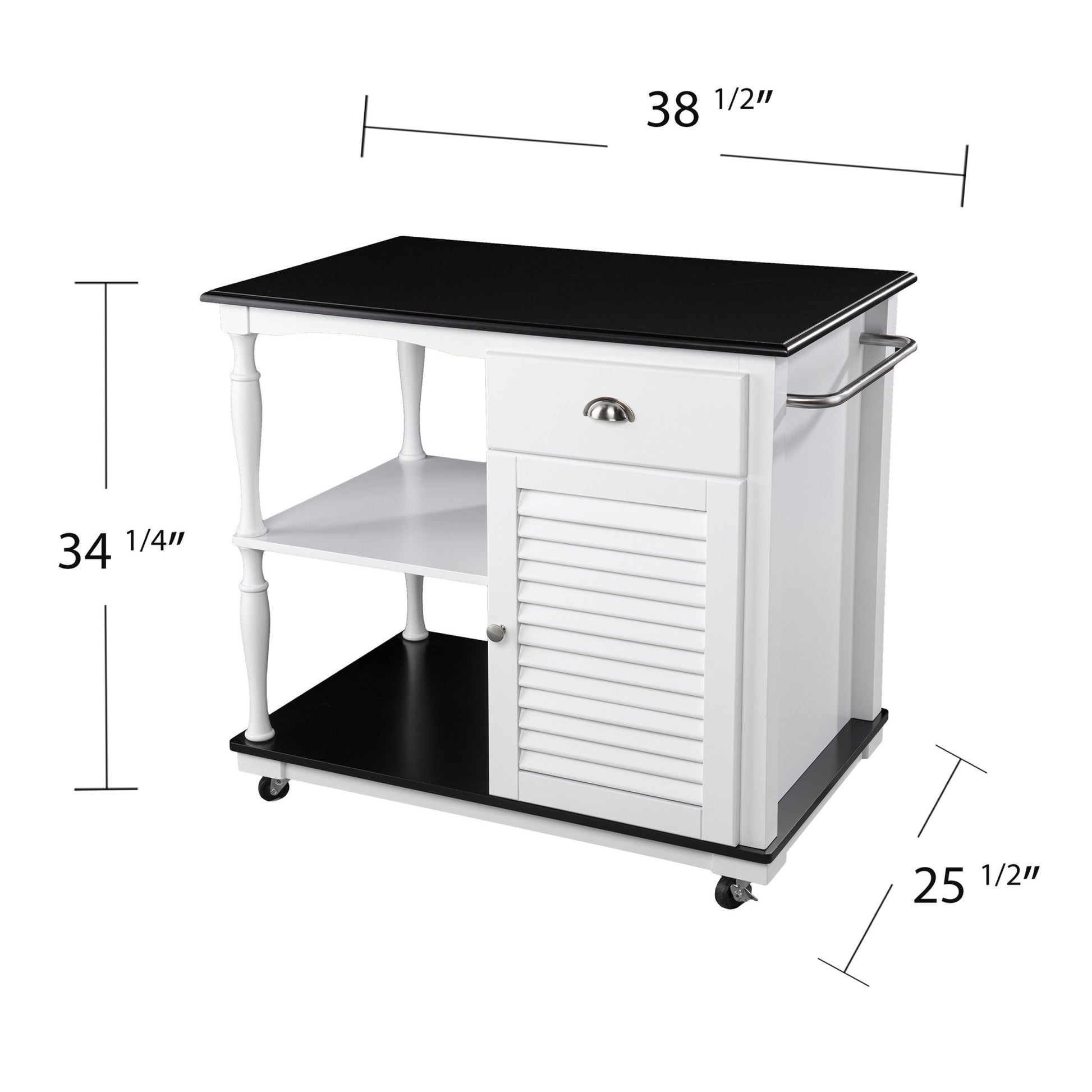 In a busy household, you need to be smart about how you organize your kitchen space. Fortunately, this black and white and black 39-inch rolling kitchen island with storage will help you provide extra counter space for food preparation, cooking, and serving. This durable manufactured wood rectangular island frees up a tremendous amount of space in your kitchen area, allowing you more flexibility as you prepare meals or serve guests. This unit features purposeful distressing for a slightly rustic and vintage design styling. Drawer storage also helps to keep those handy utensils and serving essentials neat, tidy, and ready to be used. Enhance the beauty and functionality of your kitchen space with this multi-purpose kitchen island. 34.25-inch H x 38.5-inch W x 25.5-inch d