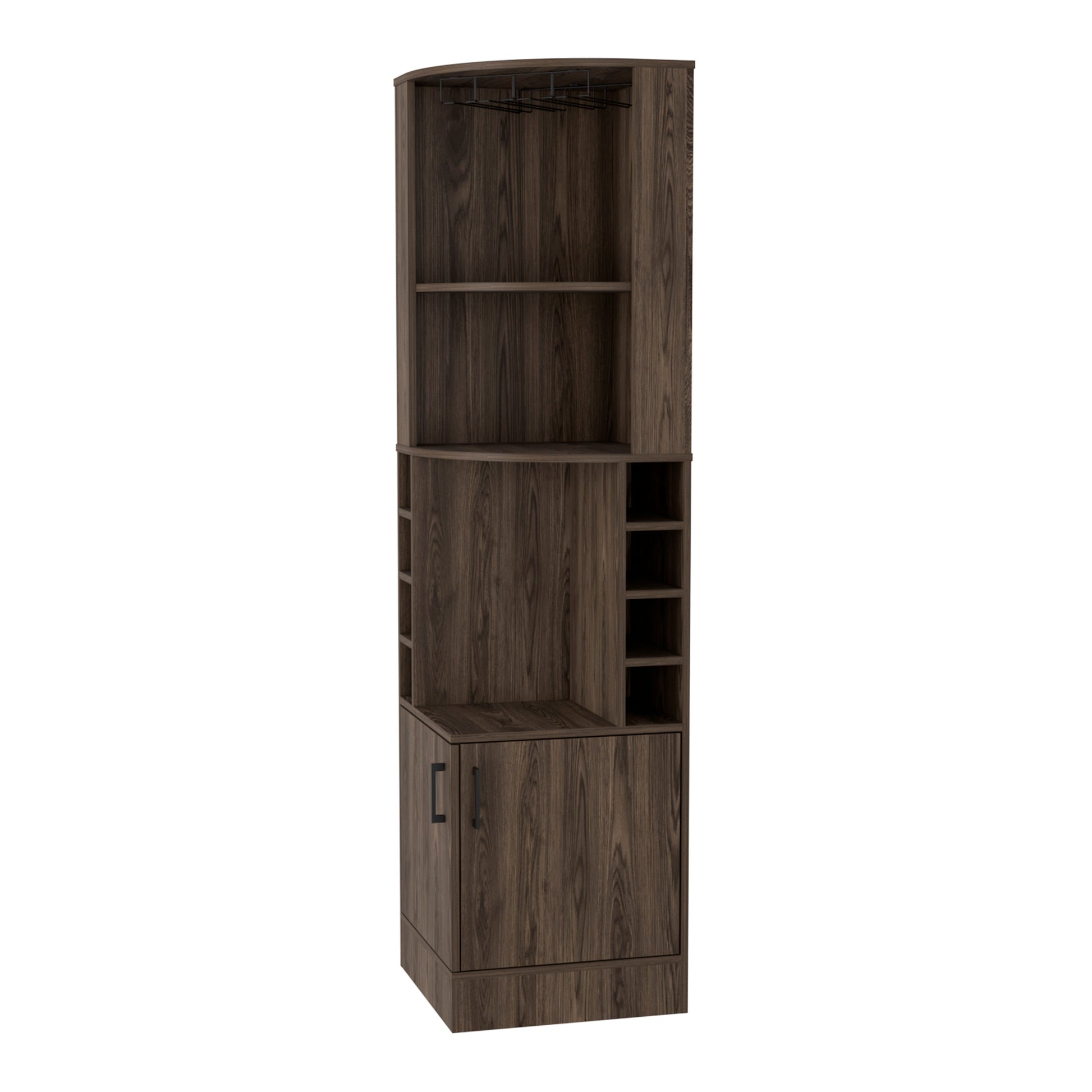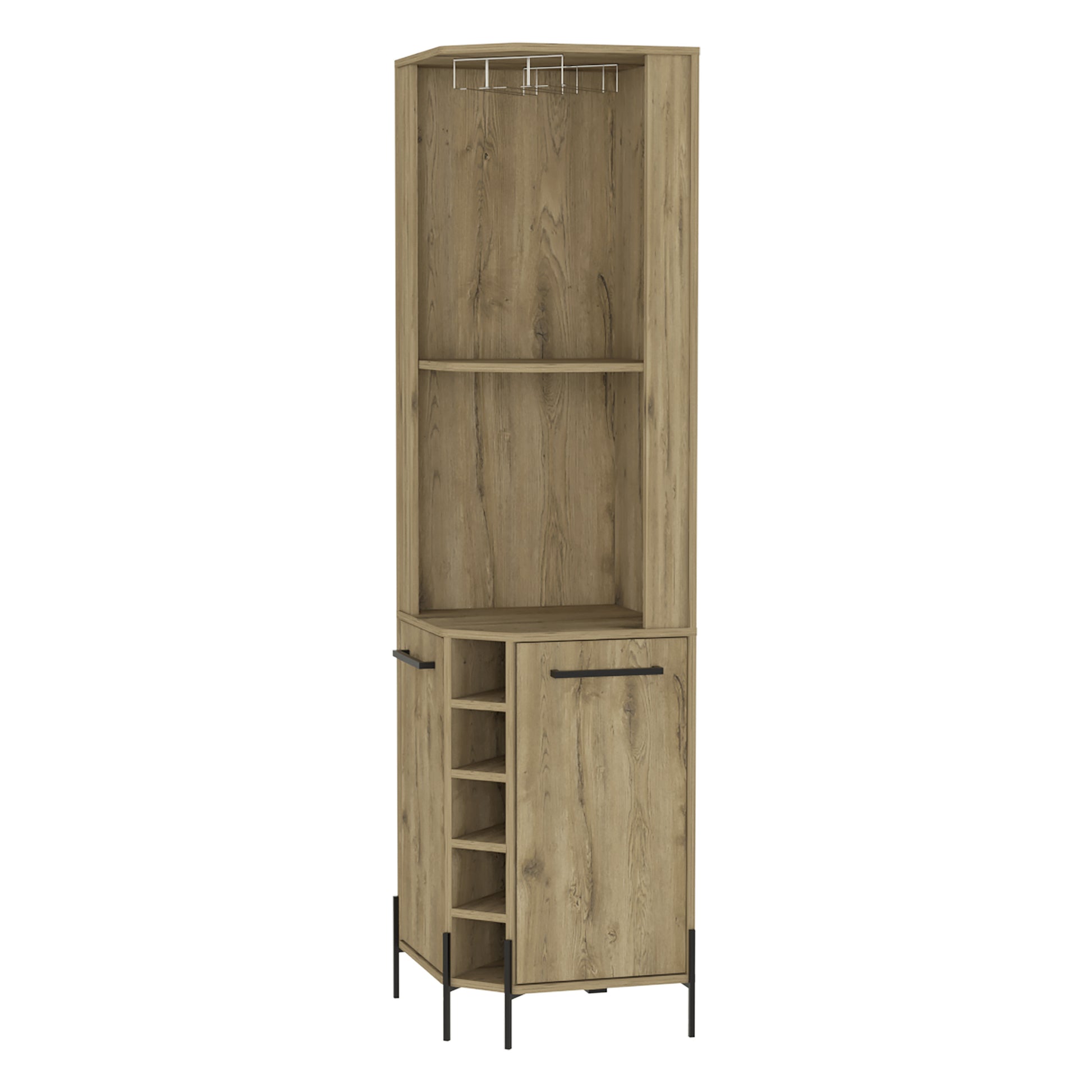 Elevate your storage game with this modern corner bar cabinet crafted from premium engineered wood. Featuring ample storage with included shelves, this freestanding piece combines style and functionality effortlessly, adding a touch of elegance to any room. The natural color and top manufactured wood material enhance its sleek design, making it a versatile and durable addition to your home décor. Ideal for those looking to maximize space without compromising on style. 71.1-inch H x 18-inch W x 18.4-inch D