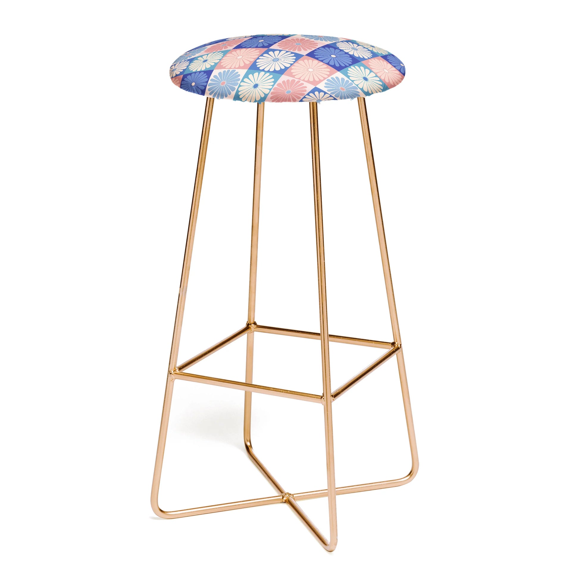 The Checker Daisies I & II Stool marries playful pattern with refined elegance. Featuring a charming checker and daisy motif on premium faux-leather upholstery, this space-conscious stool pairs gracefully curved steel legs—available in black or gold—with contemporary comfort. A strategically positioned footrest ensures ergonomic support, while its streamlined silhouette maximizes functionality in any setting. Whether positioned at a bar, kitchen counter, or accent area, this design-forward piece brings artistic sophistication to diverse interiors. Your purchase directly supports the artist, championing creative vision and fostering a global community of artistic talent and innovation.