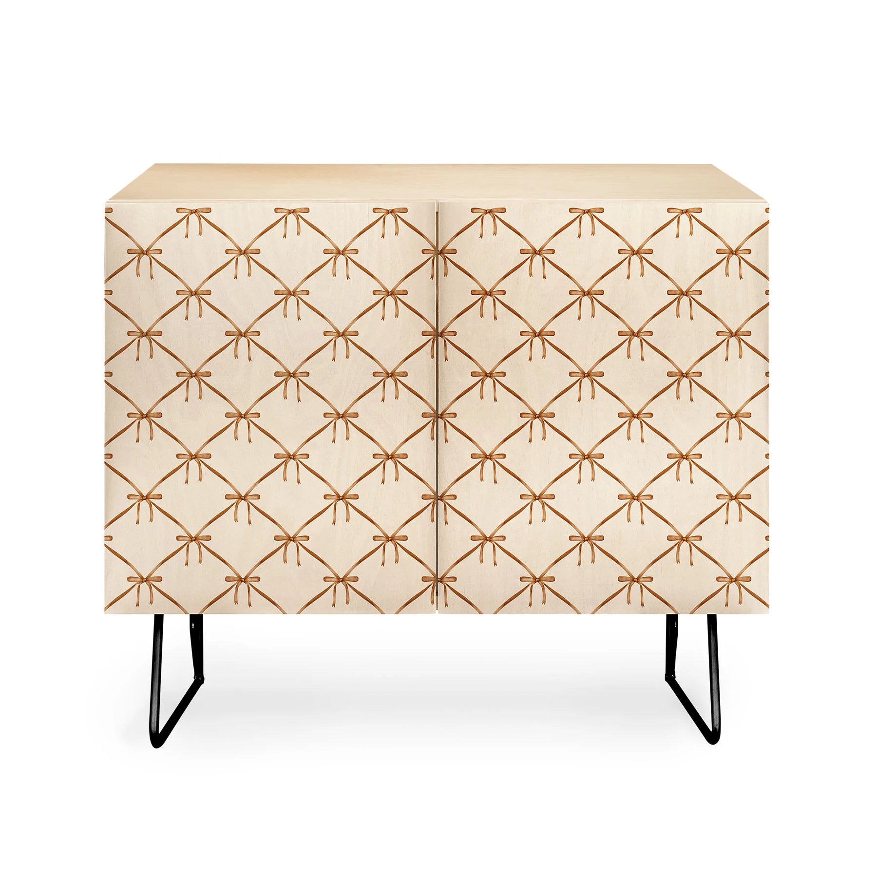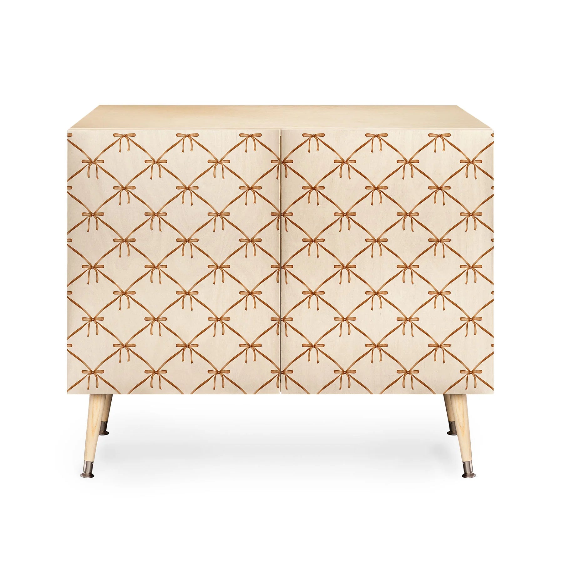 The Color Poems Bows and Ribbons Beige Credenza combines understated elegance with artistic sophistication. This Baltic Birch cabinet showcases a refined bows and ribbons pattern in soft beige tones on its doors, supported by gracefully curved steel legs that define its mid-century modern aesthetic. Perfect for office organization, entertainment display, or bar service, its adaptable design complements diverse interiors seamlessly. Select between a naturally warm finish or premium walnut veneer to harmonize with your décor. Each purchase directly benefits the artist, transforming your furniture choice into meaningful patronage of global creative talent.