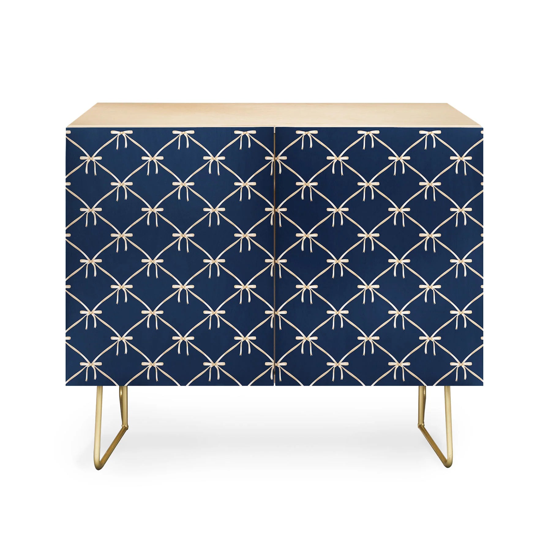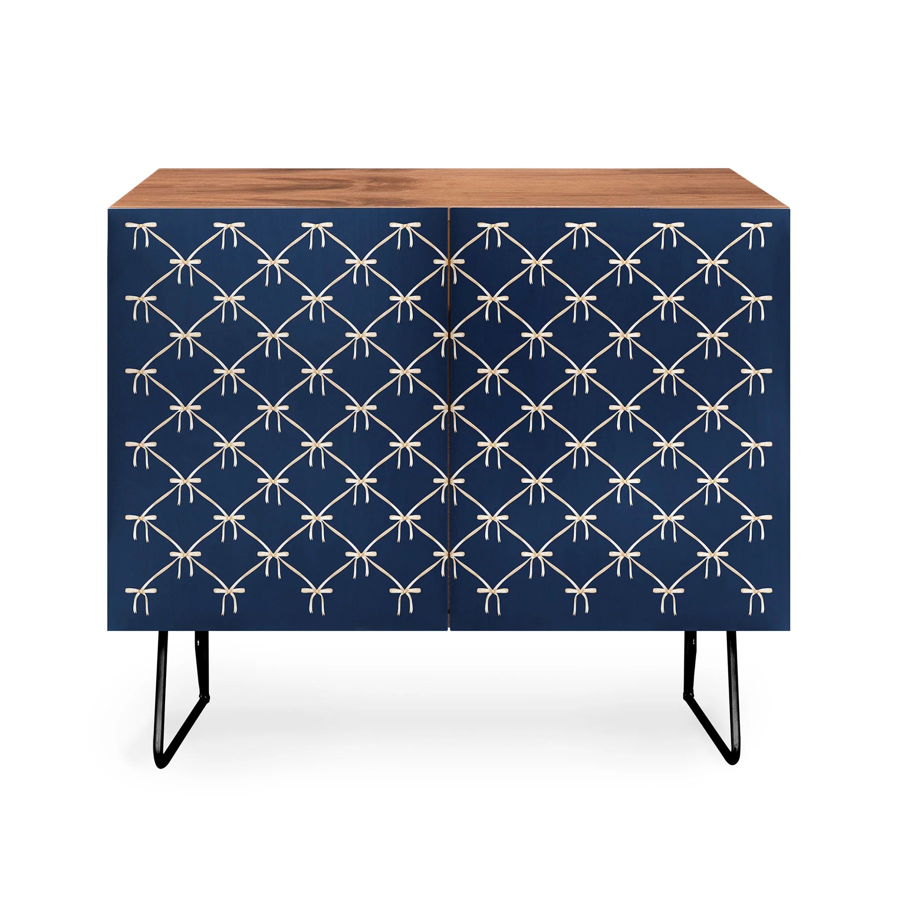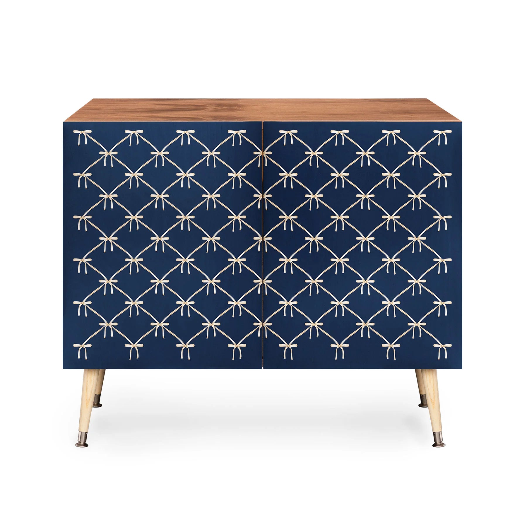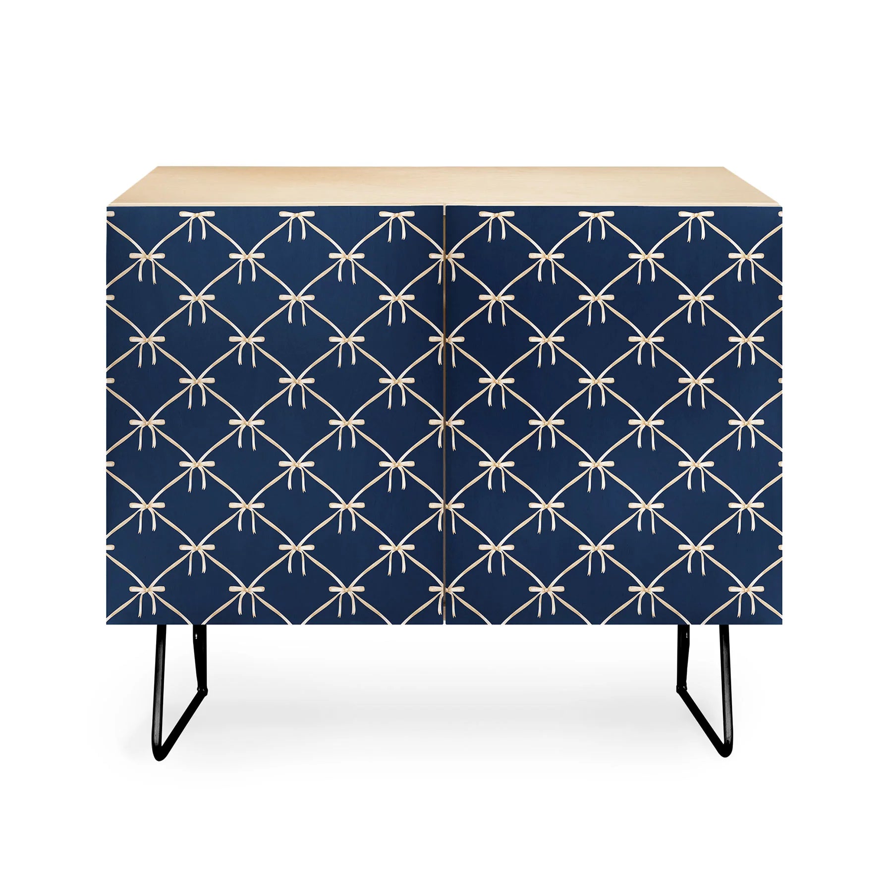 The Color Poems Bows and Ribbons Blue Credenza brings refined elegance to any room with its distinctive artistic design. Featuring a delicate bows and ribbons pattern in blue on Baltic Birch doors, this mid-century modern piece is supported by refined curved steel legs. Whether positioned as office storage, an entertainment focal point, or bar cabinet, its versatile construction adapts to your needs. Choose between a warm natural finish or rich walnut veneer to coordinate with your interior vision. Every purchase directly compensates the artist, making your investment a celebration of creative craftsmanship worldwide.