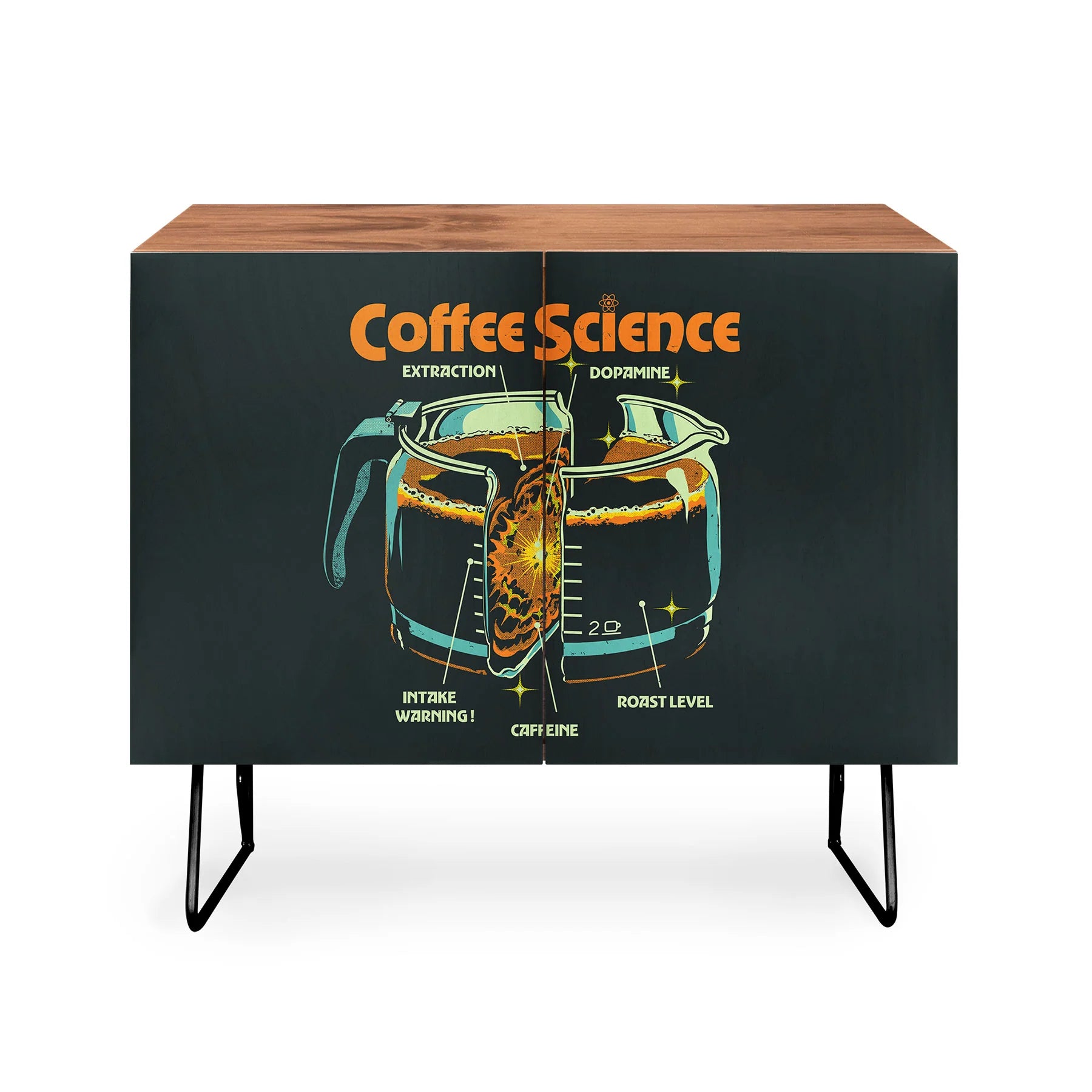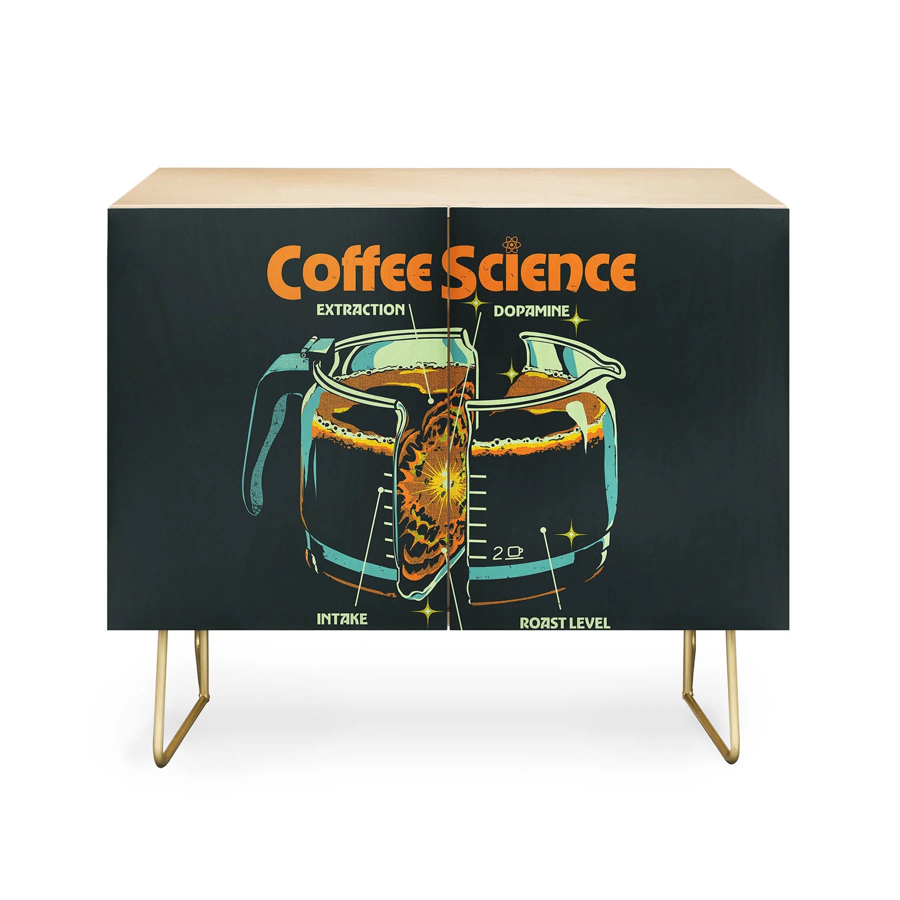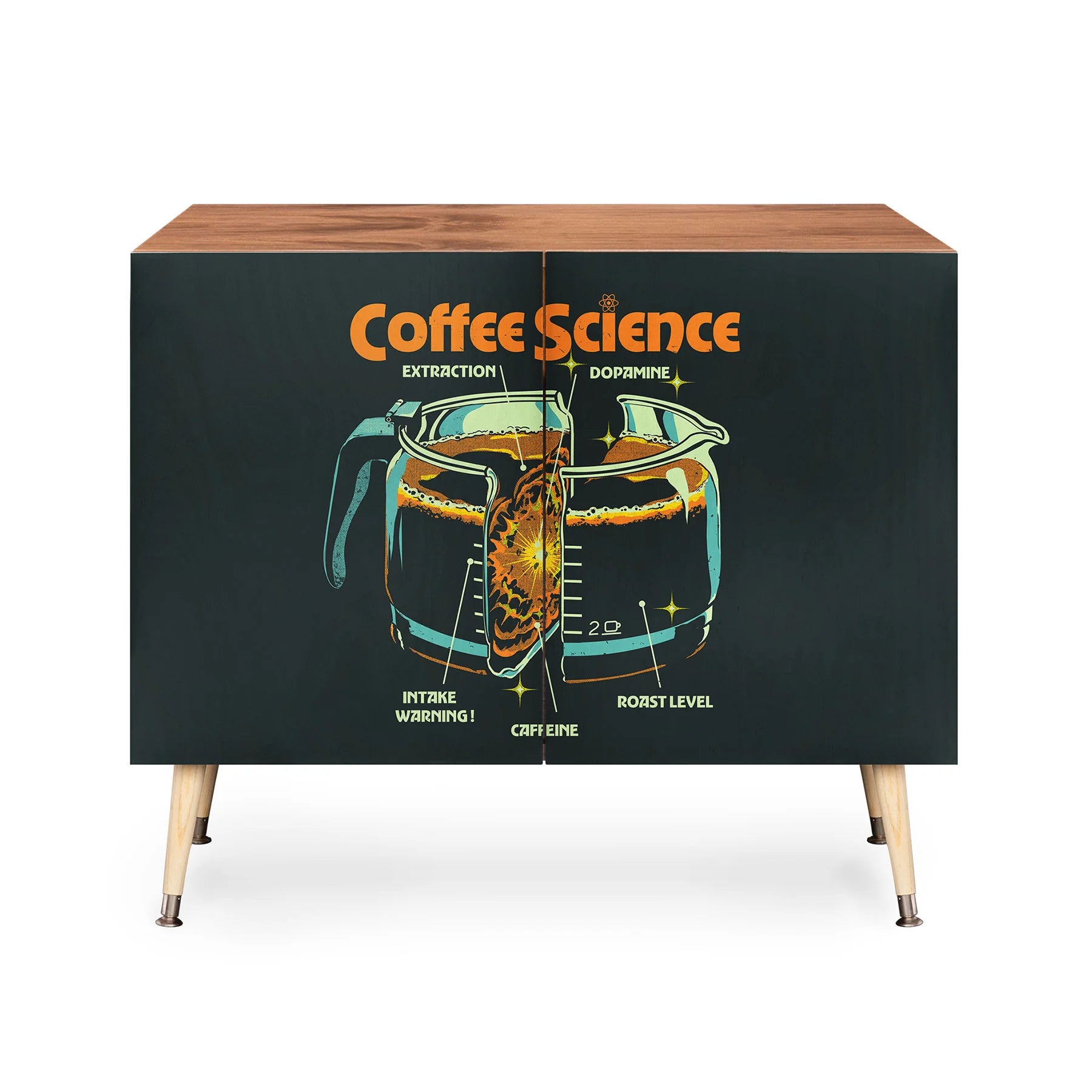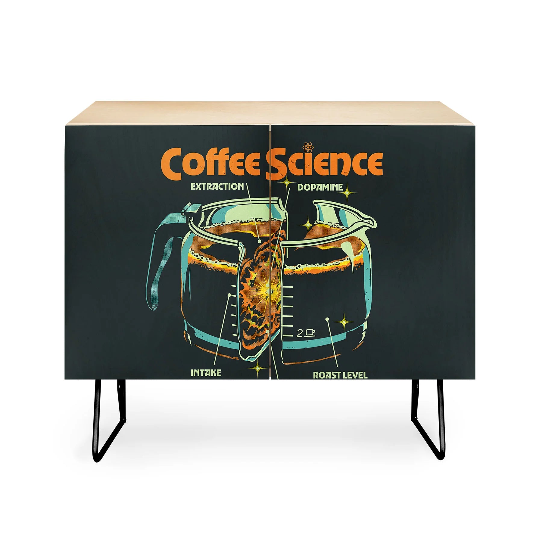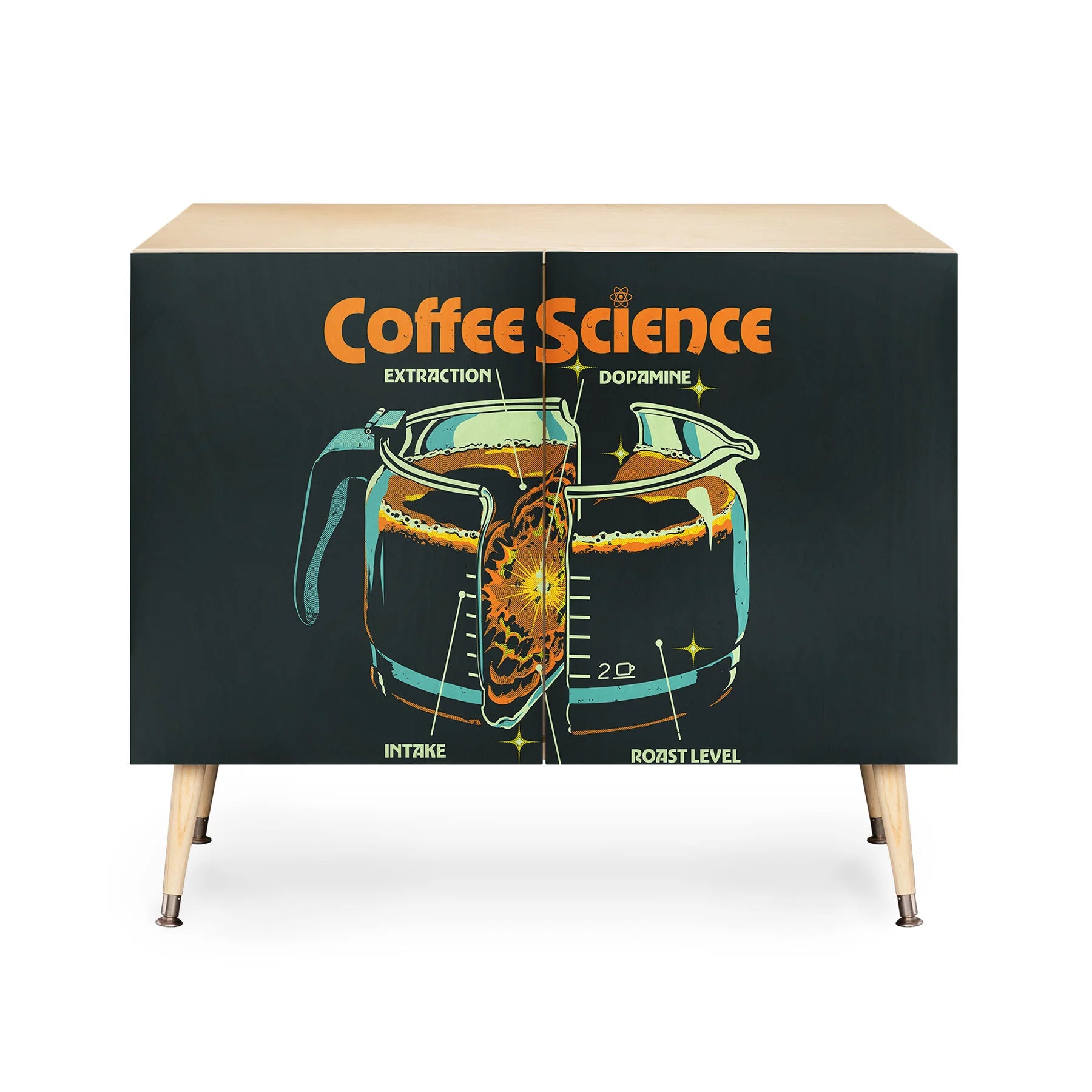 Discover the Elan Harris Coffee Science Cabinet Credenza, a refined mid-century modern statement piece that marries form with purpose. Crafted with a pristine Baltic Birch cabinet and anchored by sleek curved steel legs, this credenza brings understated elegance to any interior. Curated designs adorn the doors, allowing you to personalize your space while maintaining a cohesive aesthetic. Whether serving as an office storage solution, entertainment focal point, or sophisticated bar cart, its versatility knows no bounds. Available in a warm natural finish or luxurious walnut veneer, each configuration offers distinct character. Best of all, your purchase directly compensates the artist, fostering a global community of creative talent.