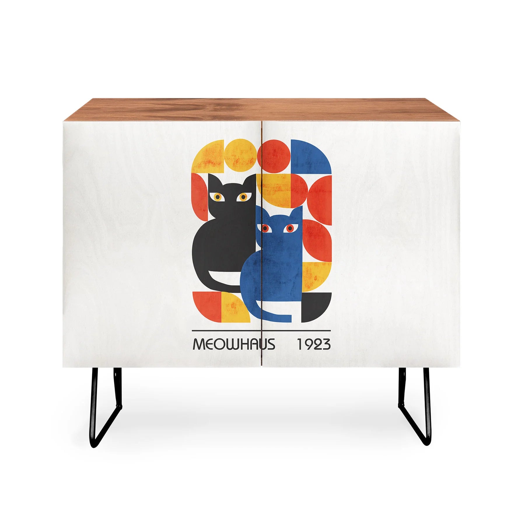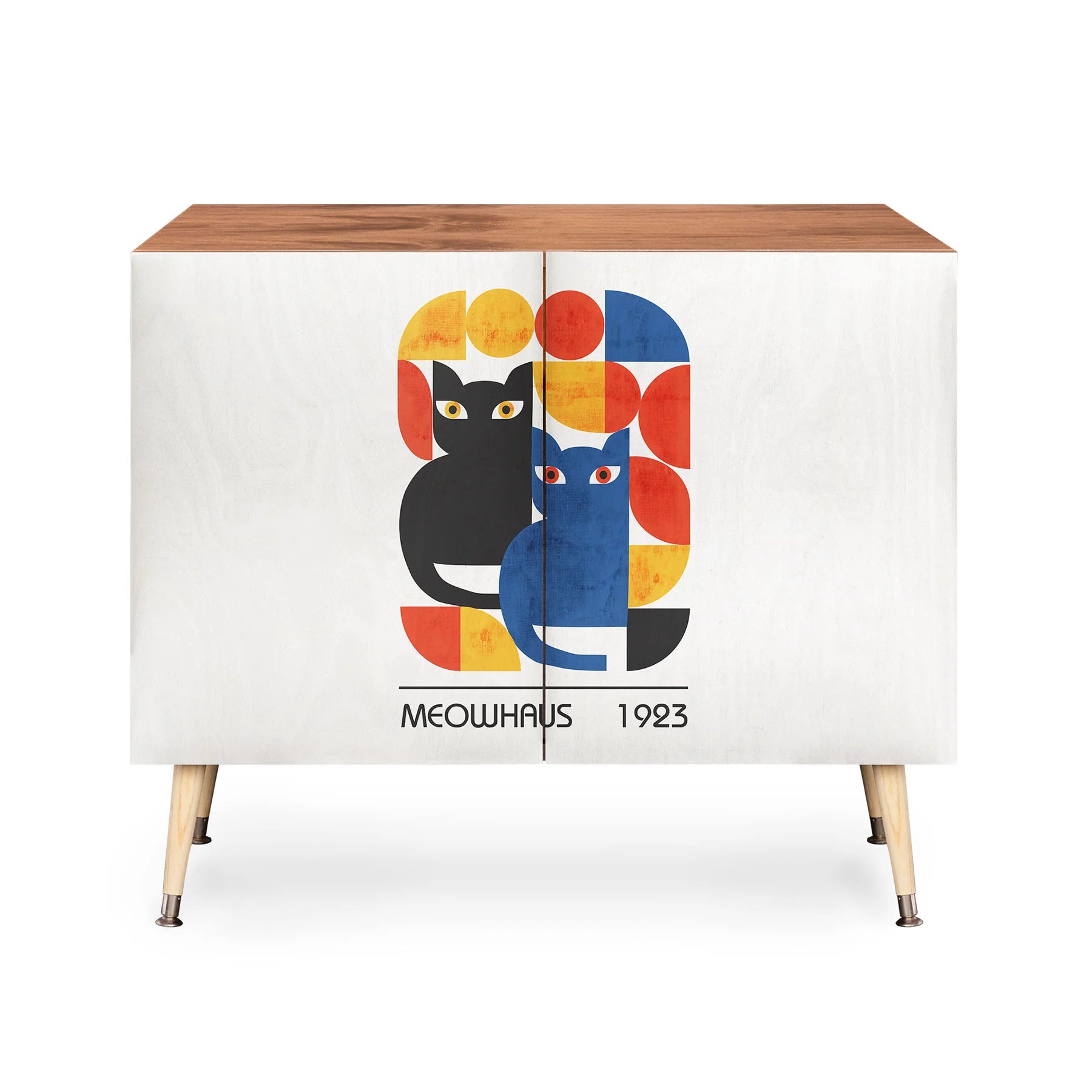 This stunning credenza merges timeless mid-century modern design with contemporary artistry. Featuring a refined Baltic Birch cabinet and gracefully curved steel legs, it anchors any room with sophisticated style. Personalize your piece by selecting from an exclusive collection of artist-designed door panels that reflect your unique aesthetic. Whether you need organized storage for your office, a striking entertainment focal point, or an elegant bar display, this adaptable furniture piece delivers on both form and function. Choose between a naturally warm finish or luxurious walnut veneer to complement your existing décor. Measuring 35.5" L x 17.5" D x 30" H with an adjustable interior shelf, it combines practical storage with artistic expression. Best of all, your investment directly supports independent artists, turning your home into a gallery that celebrates creative vision.
