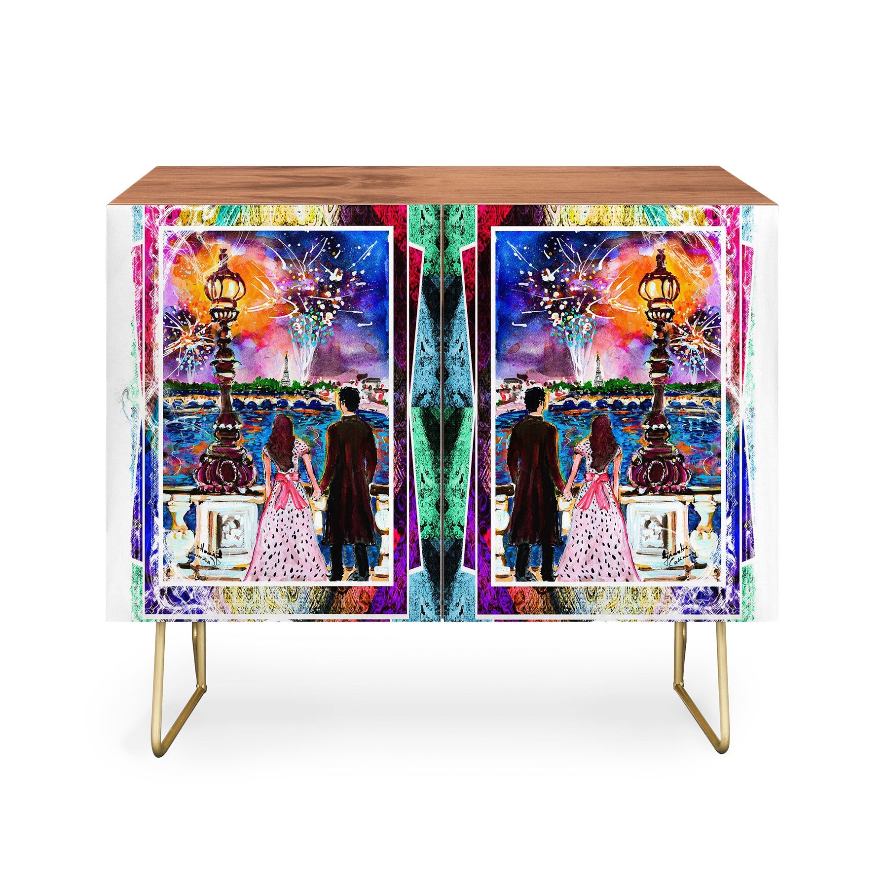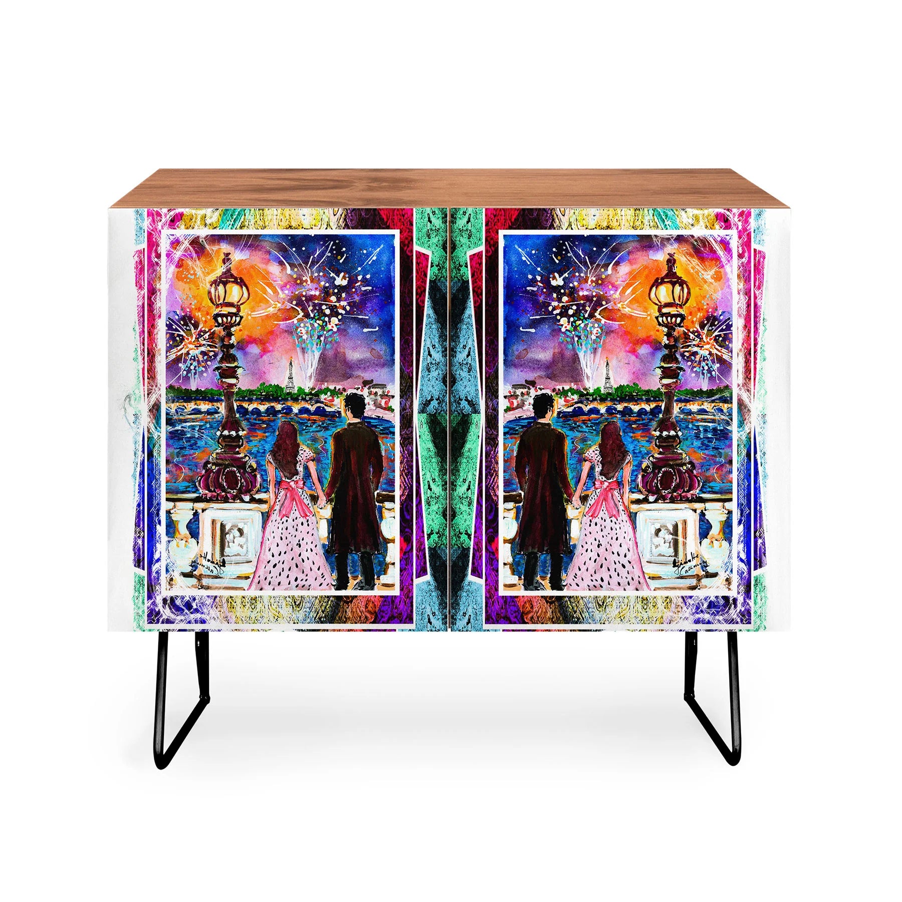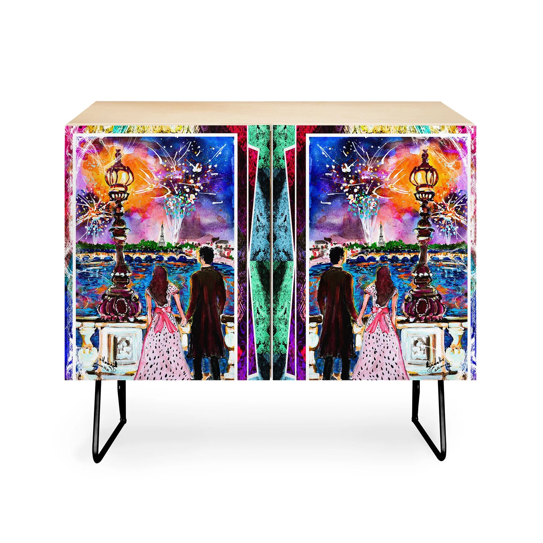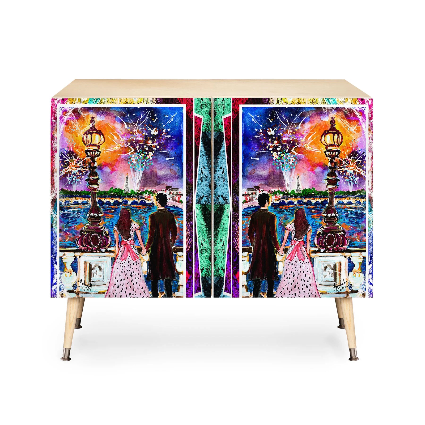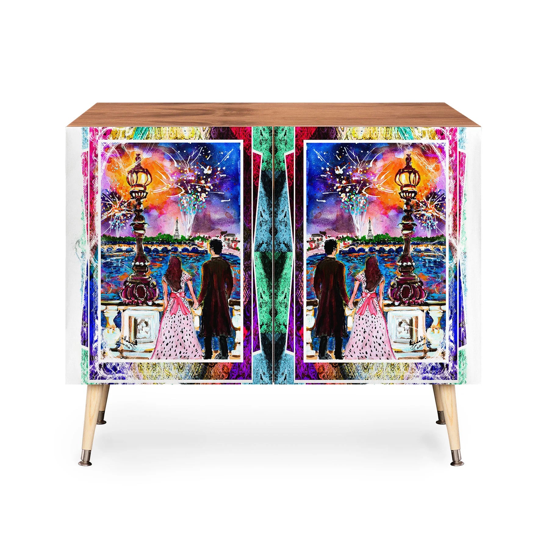 The Ginette Fine Art New Year in Paris Credenza brings Parisian sophistication to mid-century modern design. This elegant piece features Ginette's evocative artwork on its Baltic Birch cabinet doors, supported by sleek curved steel legs that define its refined aesthetic. Whether anchoring a home office, displaying cherished collections, or serving as an intimate bar, this versatile credenza adapts to your lifestyle with grace. Available in warm natural or sumptuous walnut veneer, it harmonizes with any interior vision. Each purchase directly compensates the artist, fostering meaningful support for creative talent worldwide.