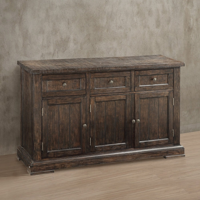 The Landon Server is a stylish and functional piece of furniture designed to enhance your dining space. With its Salvage Brown finish, this server features 3 drawers and 3 doors, providing ample storage for your dining essentials. Made from durable wood and composite materials, it boasts a sturdy construction and sophisticated design, perfect for complementing your Landon Collection dining table and chairs. Its dimensions are 63"L x 20"W x 34"H