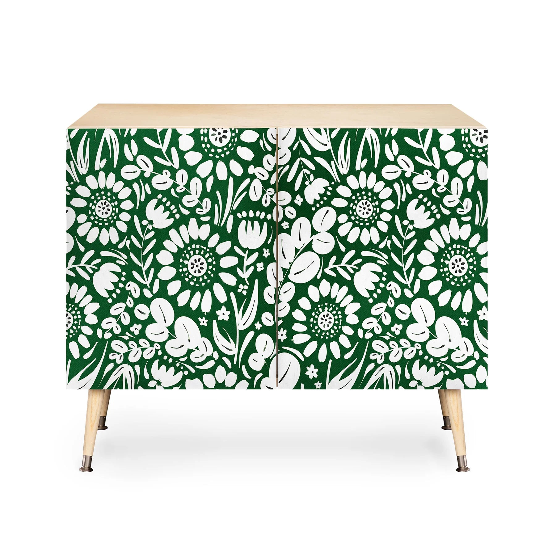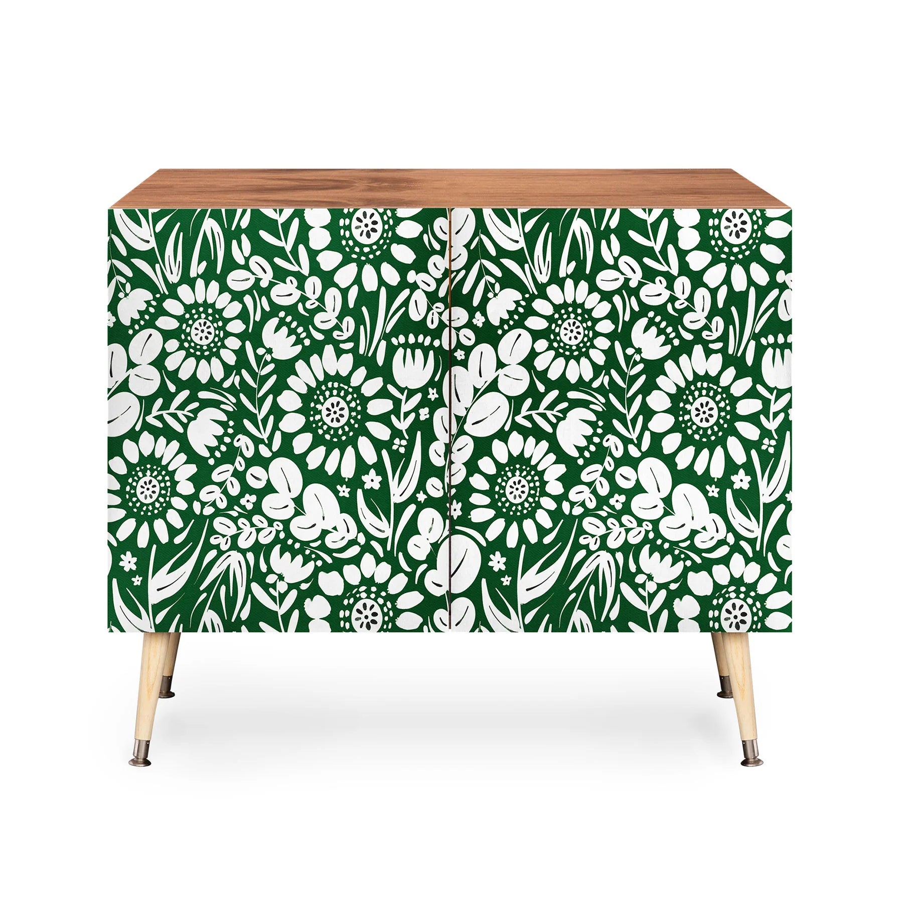 The Marta Barragan Camarasa Green Jungle Bloom Fusion Credenza merges botanical artistry with refined mid-century modern design. Featuring a sturdy Baltic Birch frame and gracefully curved steel legs, this statement piece showcases lush jungle-inspired artwork on its doors. Equally at home as office storage, a media console, or bar display, its adaptable silhouette complements diverse interiors. Select between a naturally warm finish or luxurious walnut veneer to suit your space. What sets this credenza apart is its purpose: every purchase directly compensates the artist, ensuring your investment supports creative talent globally while elevating your home with curated, meaningful design.