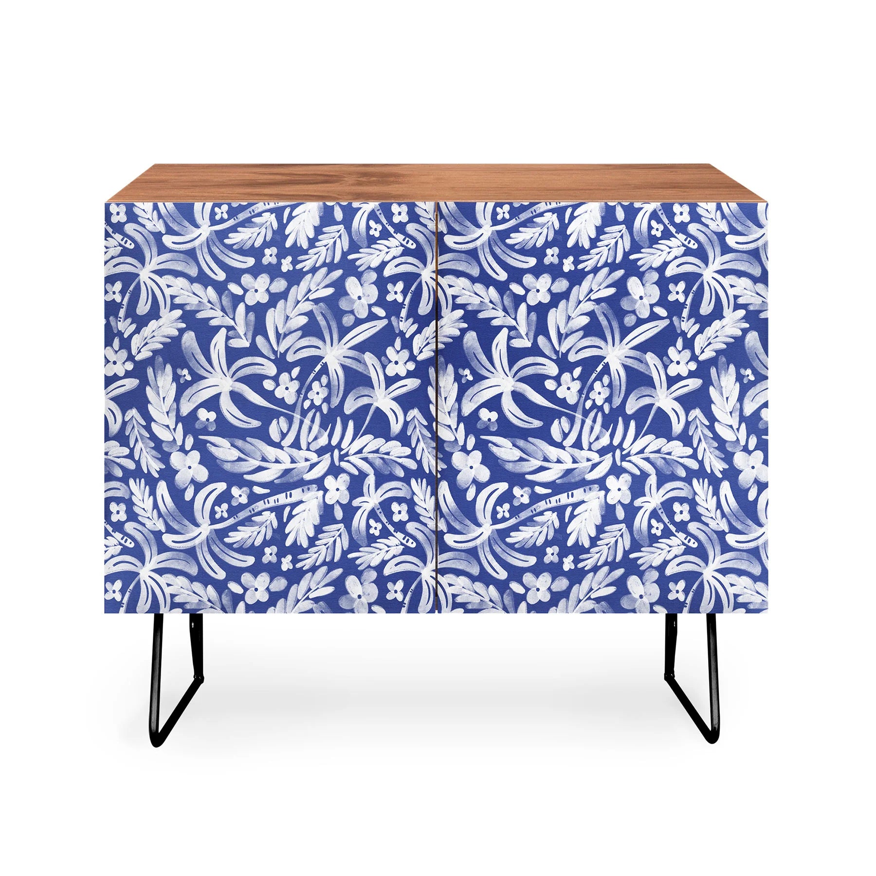 The Marta Barragan Camarasa Indigo Tropical Oasis Cabinet Credenza merges timeless mid-century modern design with lush botanical artistry. Constructed from Baltic Birch with distinctive curved steel legs, this versatile piece enhances any interior—functioning as refined office storage, a striking entertainment focal point, or a distinguished bar display. Choose between a naturally warm finish or premium walnut veneer to align with your design aesthetic. The exquisite indigo tropical oasis artwork adorning the cabinet doors introduces serene beauty and artistic sophistication to your space. Each purchase directly compensates the artist, transforming your furniture investment into meaningful support for creative vision and artistic excellence on a global scale.