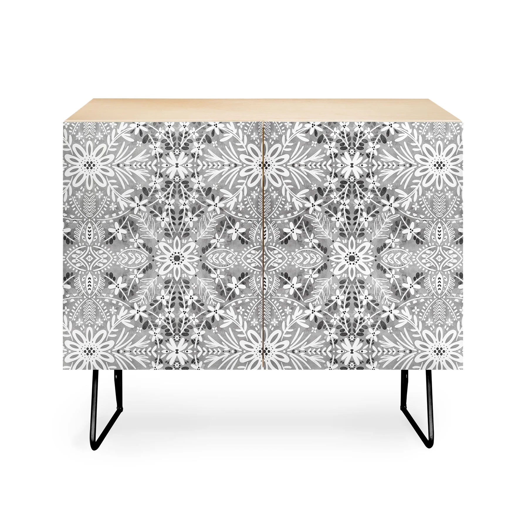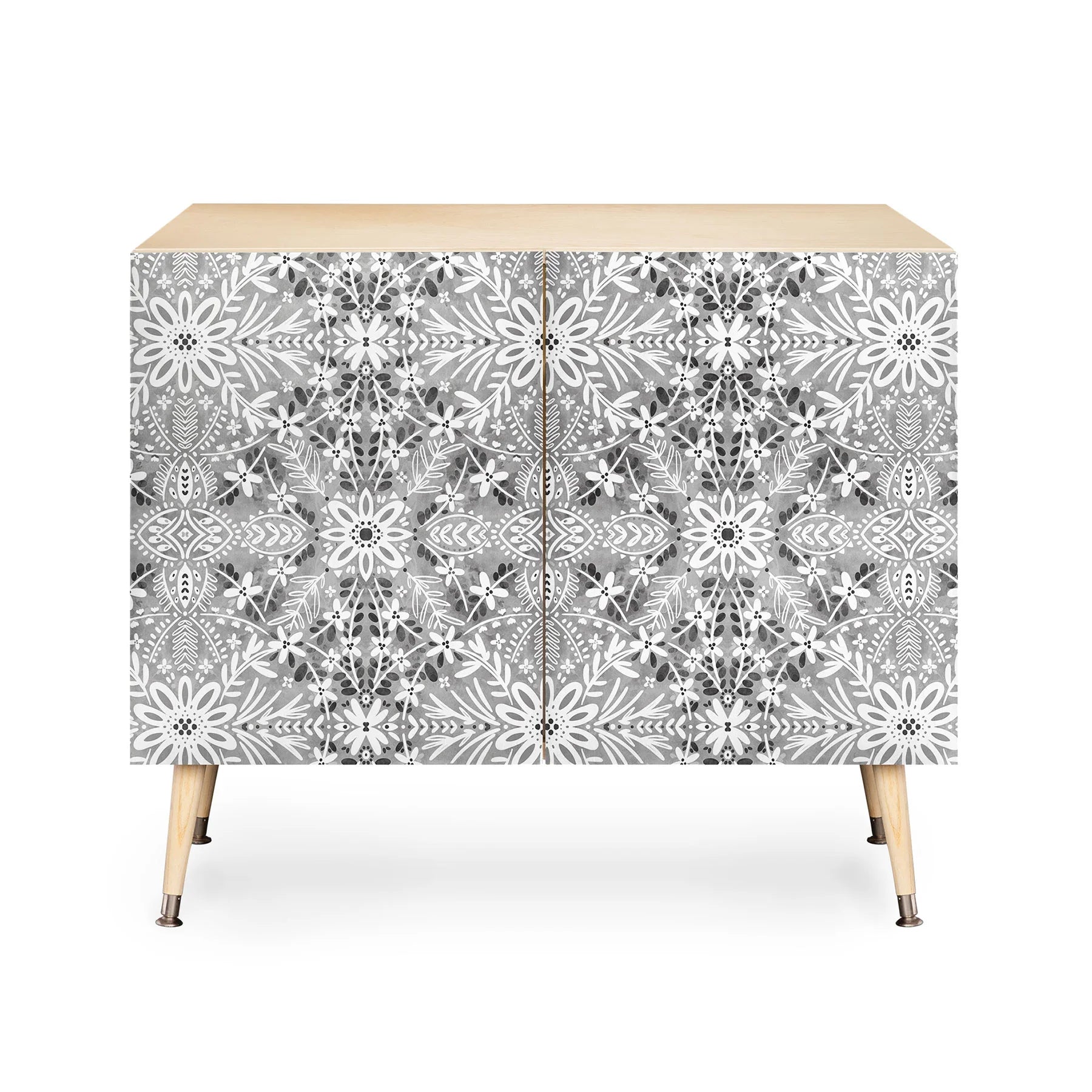 The Marta Barragan Camarasa Intricate Floral Symmetry Credenza marries timeless mid-century modern design with artistic botanical elegance. Featuring a sturdy Baltic Birch cabinet anchored by gracefully curved steel legs, this piece functions beautifully as office storage, an entertainment focal point, or a refined bar display. Choose between a warm natural finish or luxurious walnut veneer to suit your interior vision. The intricate floral artwork adorning the cabinet doors transforms this functional furniture into a gallery-quality statement piece. Each purchase directly compensates the artist, allowing you to curate a sophisticated space while supporting creative vision across the globe.
