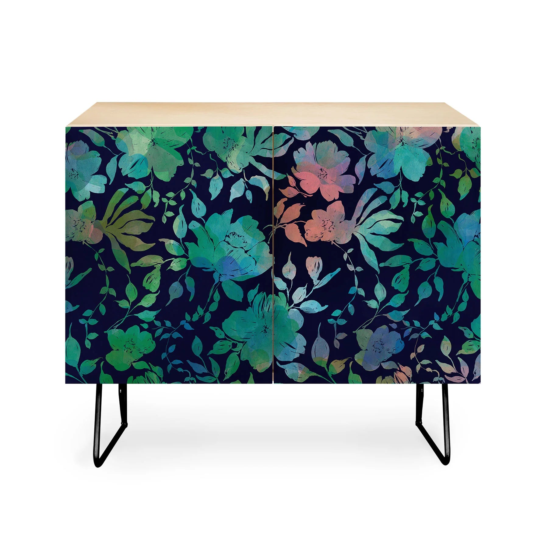 Elevate your space with Marta Barragan Camarasa's Lush Evening Botanicals Credenza. With stunning floral prints adorning the doors and a sleek, modern design, this credenza is sure to add a touch of elegance to any room. Made with high-quality materials, it's as durable as it is beautiful.