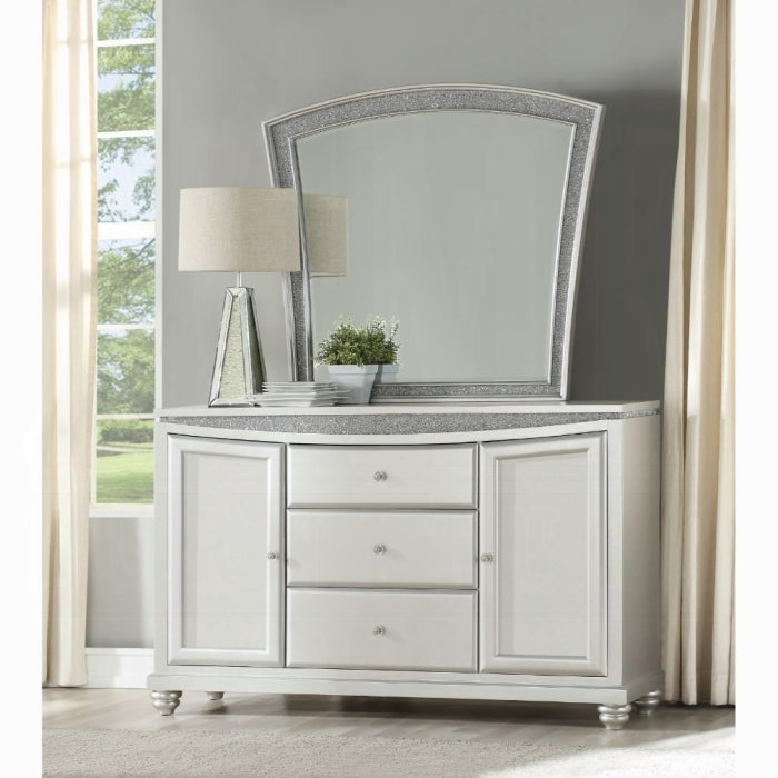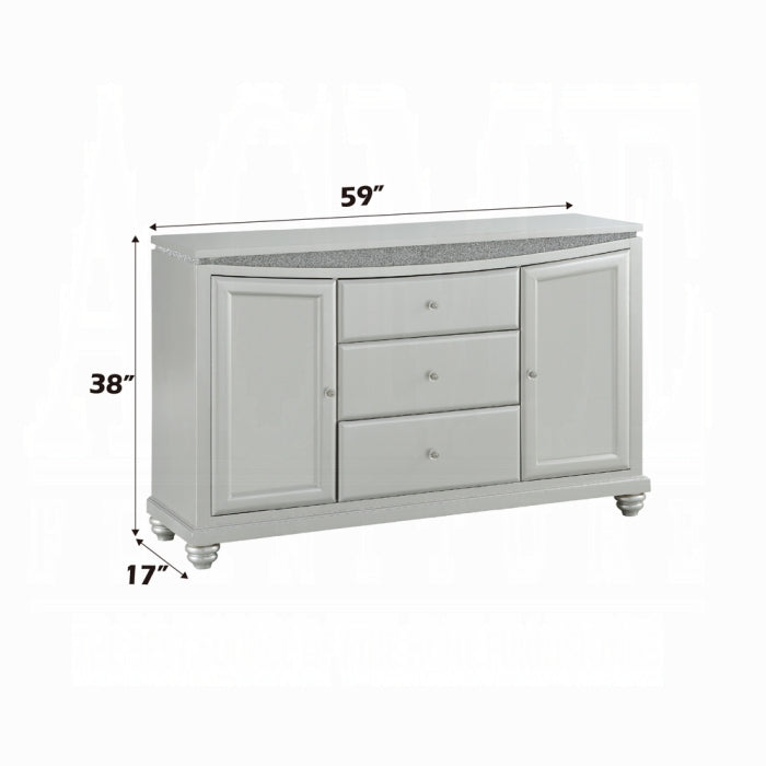 Make your dining room the centerpiece of your home with the Maverick dining set. This unique set comes in a platinum finish and sparkling rhinestone. The removable extension leaf which will create plenty of seating space and a welcoming place for all those who gather for a meal. Enhance your dining area with this stunning set.