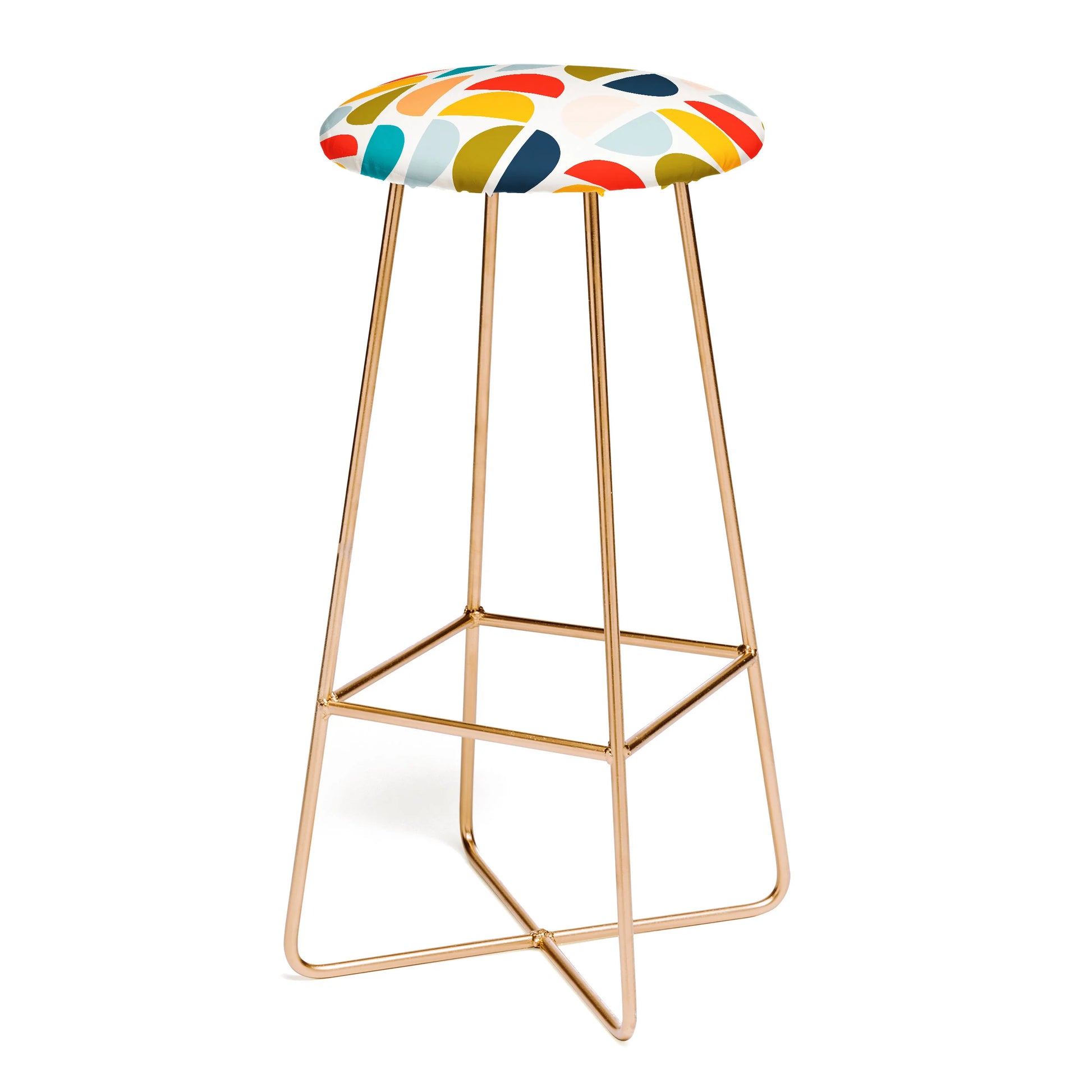 The Mid Century Geometric Vibes I Stool channels retro-modern sophistication through contemporary design. Featuring a striking geometric pattern inspired by mid-century aesthetics on sumptuous faux-leather, this compact stool pairs elegantly curved steel legs—available in black or gold—with refined comfort. A conveniently positioned footrest provides ergonomic support, while its space-efficient profile suits any interior seamlessly. Whether positioned at a bar, kitchen counter, or accent area, this design-forward piece brings artistic flair to functional spaces. Your purchase directly supports the artist, fostering a global community dedicated to creative excellence and artistic innovation.