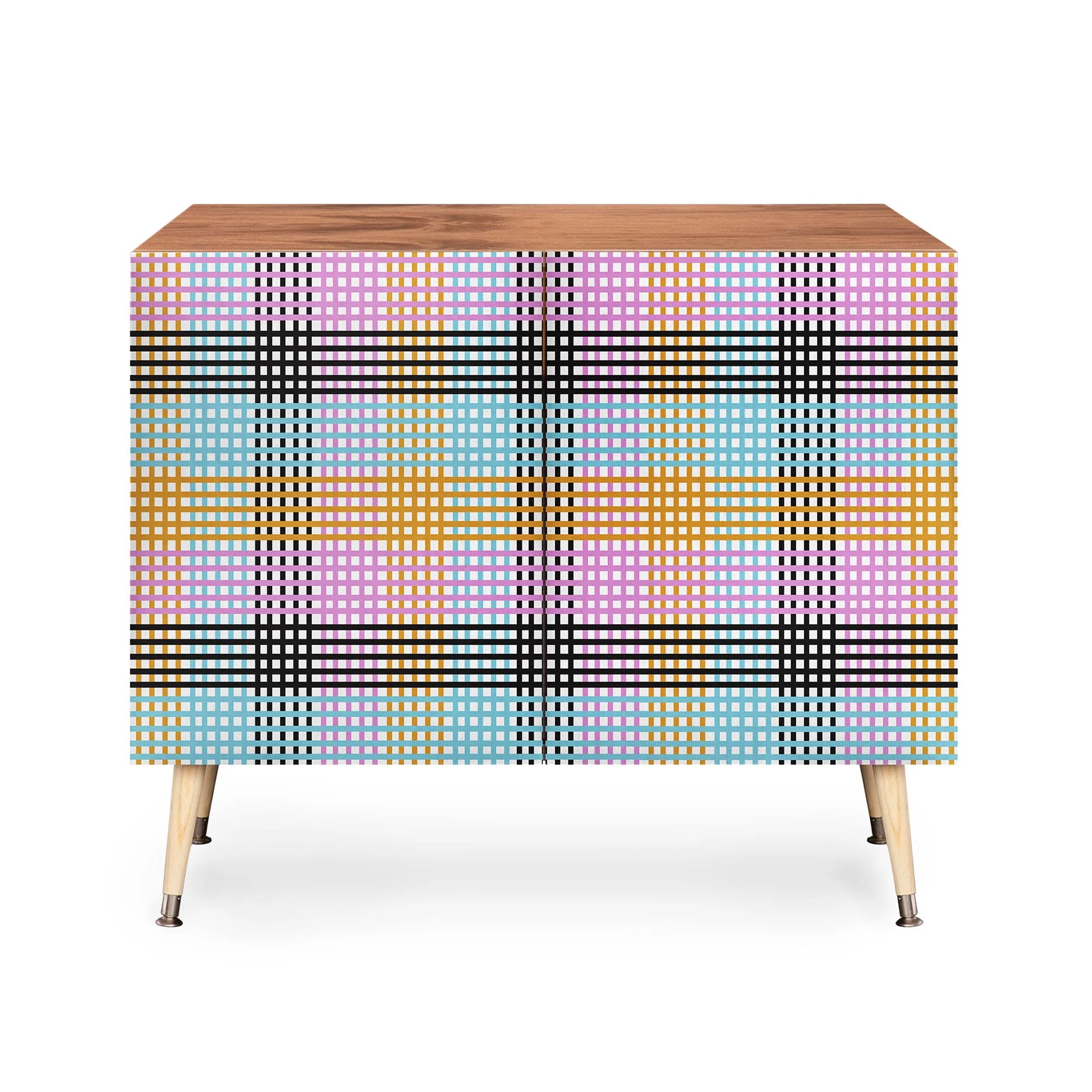 The Mirimo Multicolor Gingham Grid Credenza brings refined mid-century modern design to your home with its clean Baltic Birch construction and elegantly curved steel legs. This sophisticated storage solution seamlessly transitions between spaces—perfect as an office organizer, media console, or statement bar piece. Select your preferred aesthetic with either a naturally warm finish or premium walnut veneer to complement your décor. The curated gingham pattern on the cabinet doors adds visual interest while maintaining understated elegance. Your purchase directly supports the artist behind this design, allowing you to furnish your space while investing in creative talent worldwide.