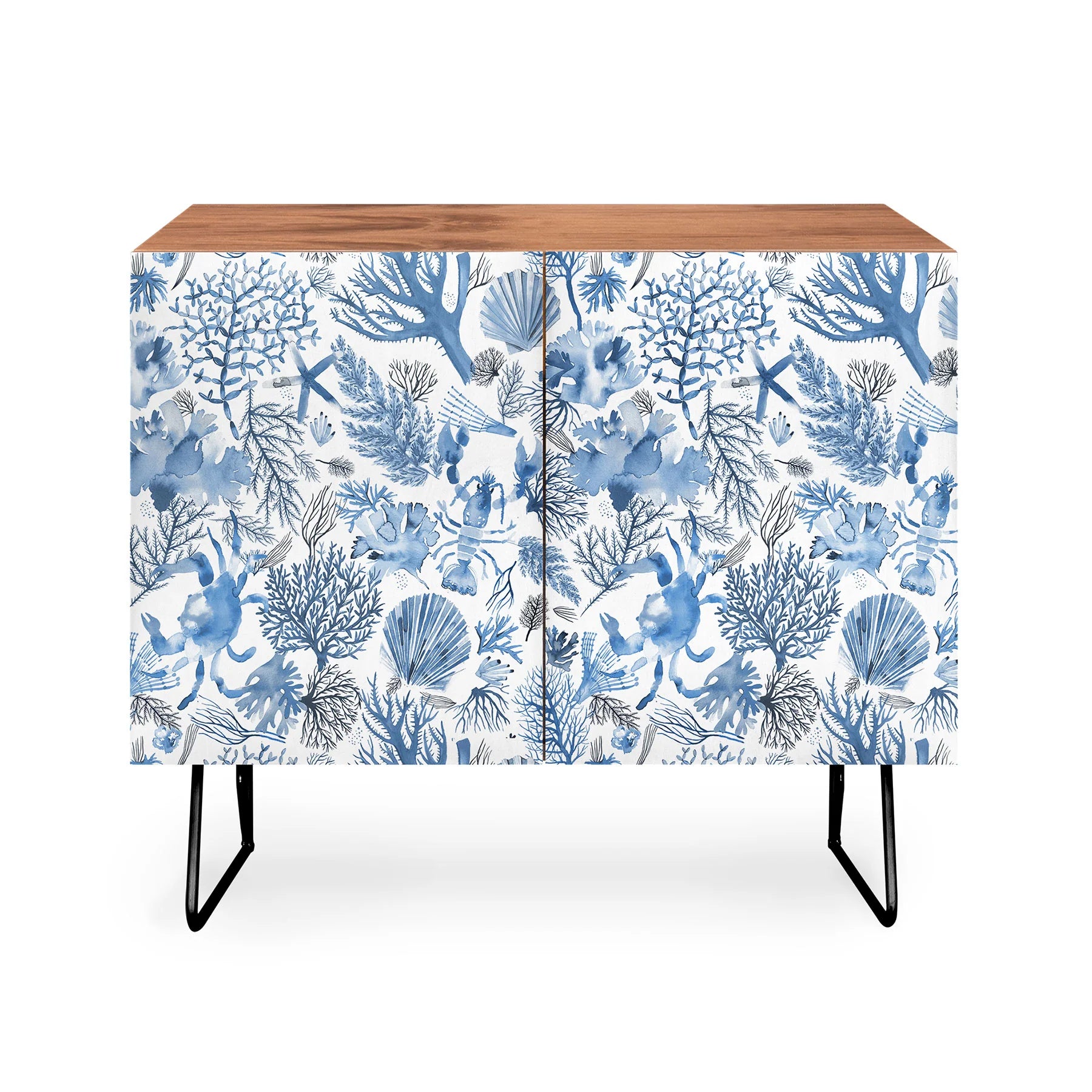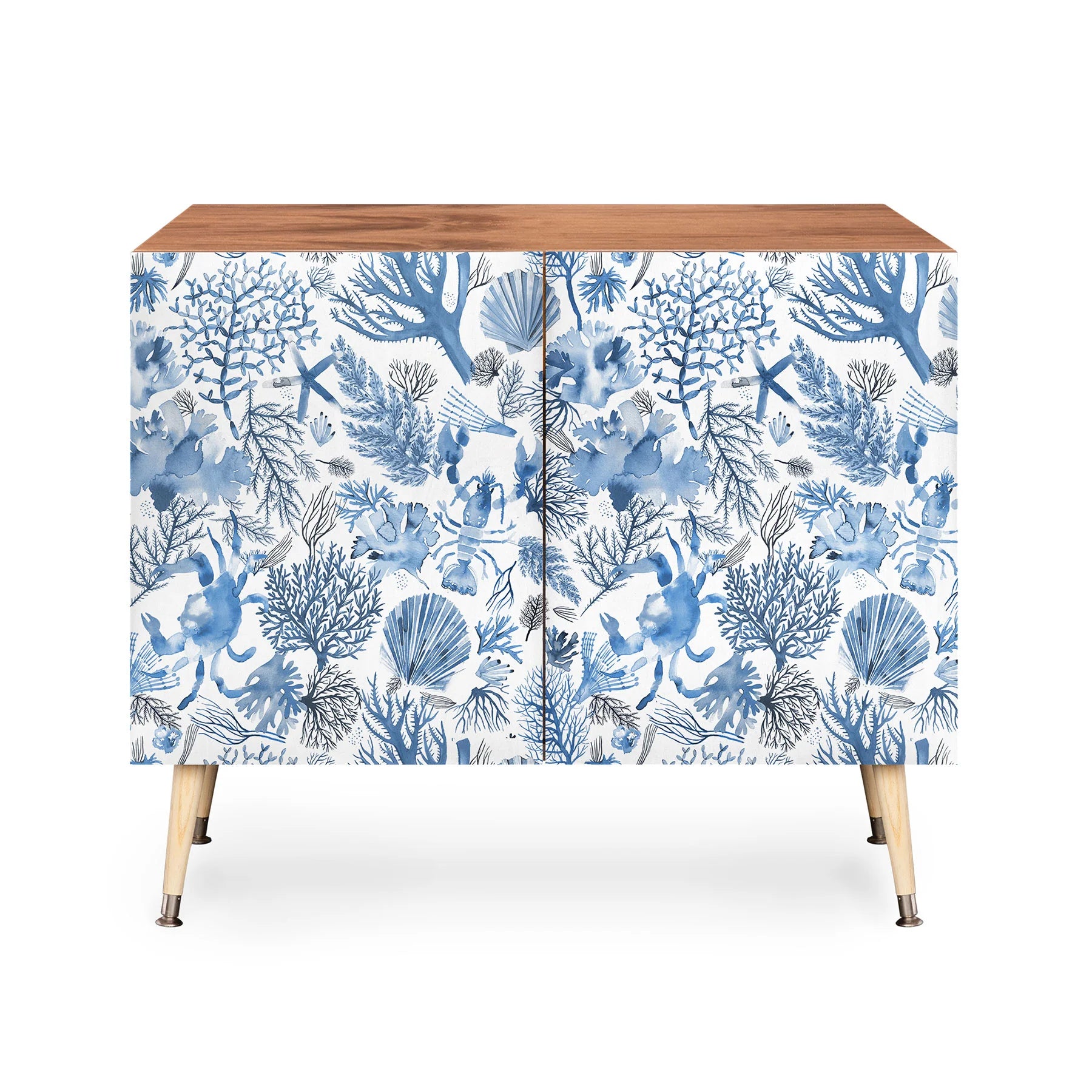 The Ninola Design Coral Blue Cabinet Credenza infuses vibrant artistry into timeless mid-century modern design. Crafted from Baltic Birch with striking coral and blue imagery, this statement piece stands on elegantly curved steel legs that underscore its refined proportions. Transition effortlessly between roles—from executive workspace to entertainment focal point to curated bar display—adapting to your dynamic lifestyle. Select your preferred aesthetic with either a naturally luminous finish or sumptuous walnut veneer, each unlocking distinct design narratives. This credenza transcends functional furniture by directly empowering the artist whose vision adorns its doors, transforming your purchase into a celebration of creative excellence and global artistic support.