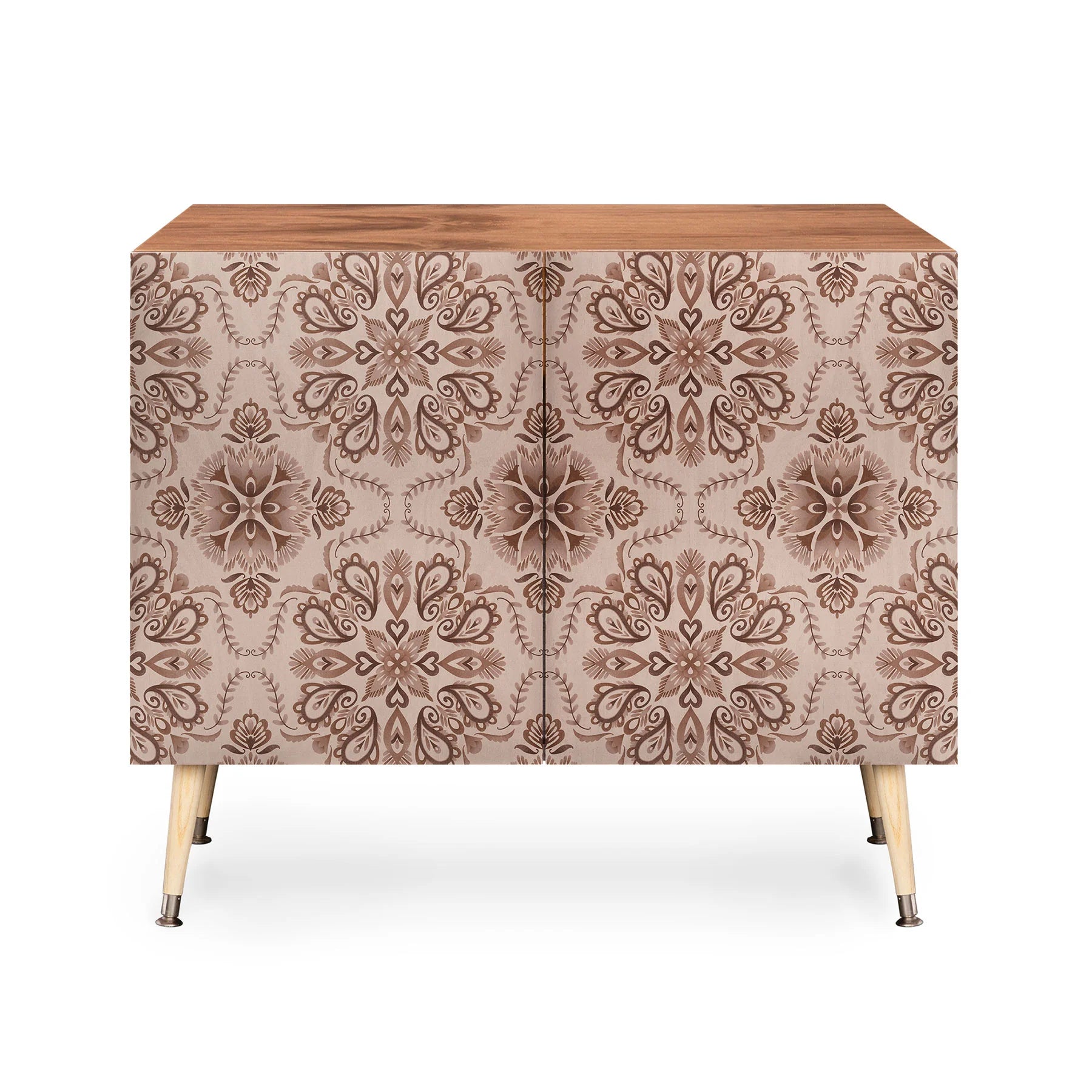 The Pimlada Phuapradit Floral Tiles Light Brown Credenza exemplifies understated elegance with its clean mid-century modern proportions and refined aesthetic. Constructed from Baltic Birch with gracefully curved steel legs, this cabinet showcases delicate floral tile patterns in warm light brown tones across its doors. Available in either a naturally soft finish or richly textured walnut veneer, it adapts effortlessly to your design vision. Perfect as workspace storage, living room focal point, or sophisticated bar display, this versatile piece anchors any room with timeless style. Every purchase directly compensates the artist, nurturing a worldwide network of creative talent.
