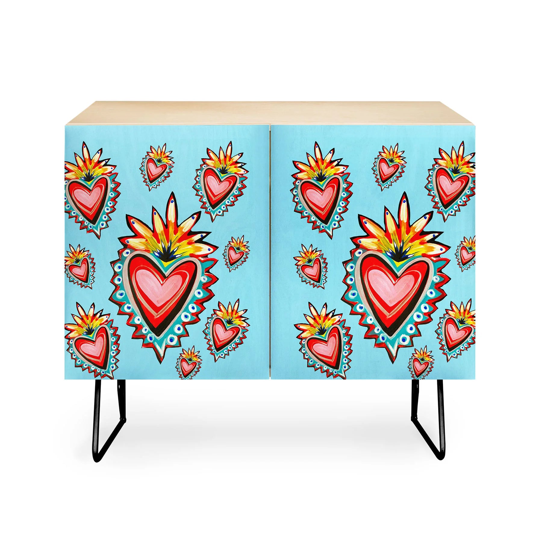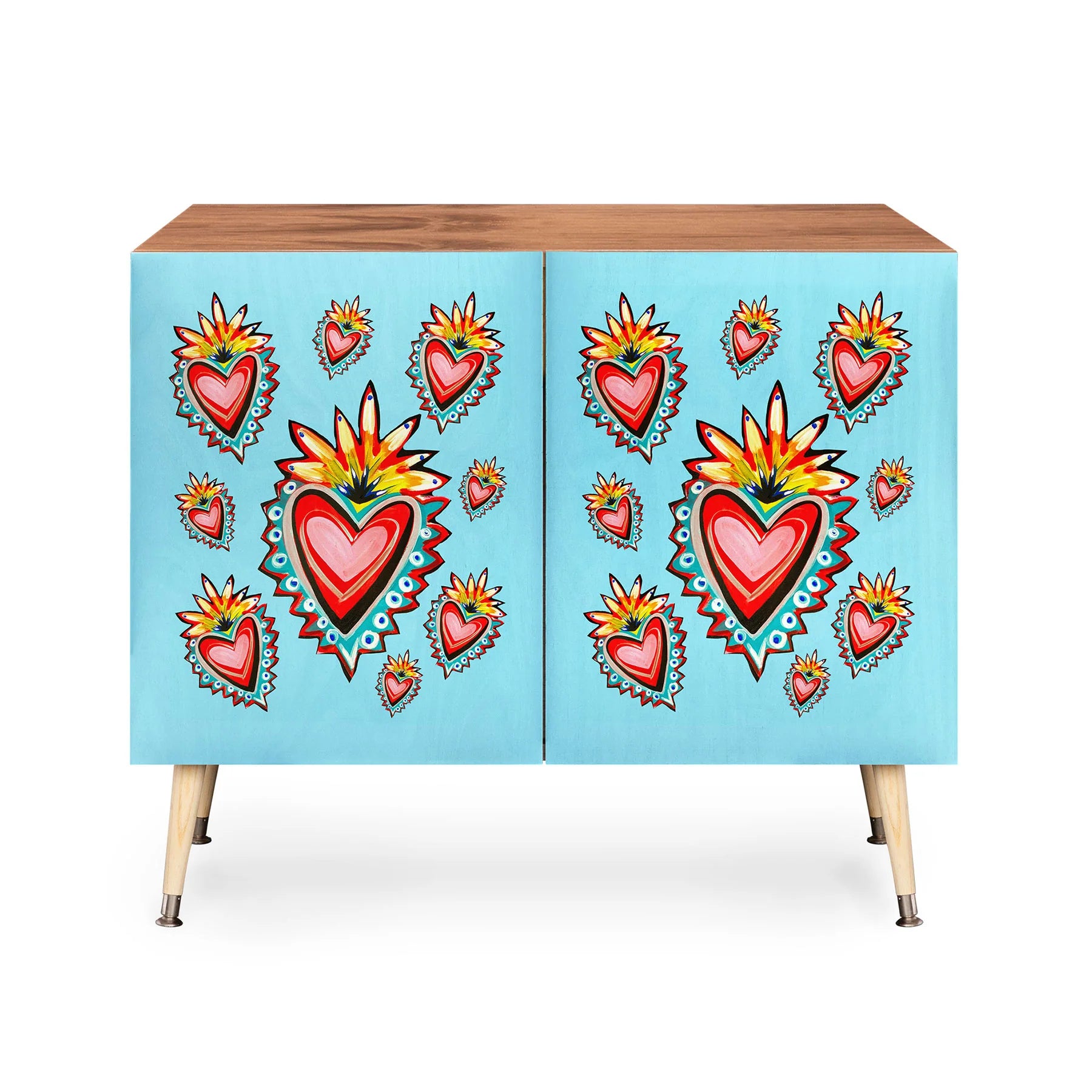 The Tina Salazar Hearts in Blue Credenza combines mid-century modern refinement with heartfelt artistic expression. Featuring a sturdy Baltic Birch cabinet supported by gracefully curved steel legs, this versatile piece transitions seamlessly across your home—from executive workspace to entertainment hub to refined bar display. Choose between a naturally warm finish or luxurious walnut veneer to complement your interior vision. The thoughtfully curated blue heart artwork adorning the cabinet doors adds emotional depth and visual charm to any room. Each purchase directly compensates the artist, enabling you to create a sophisticated sanctuary while supporting creative talent and artistic passion worldwide.