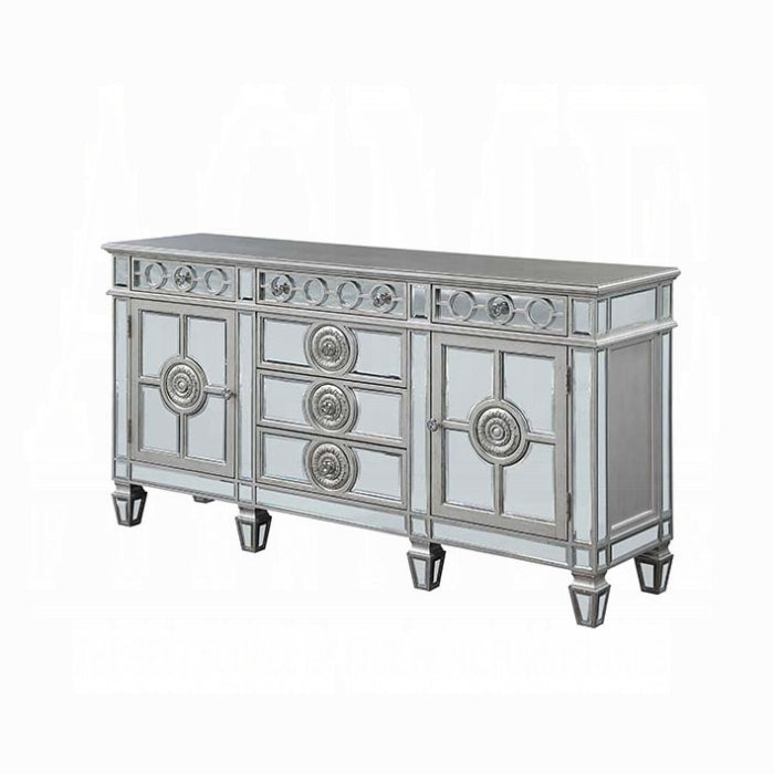 • Wooden Top Frame, Raised Geometric Trim, Beveled-Mirror Inlay (Door/Drawer/Case), Tapered Leg